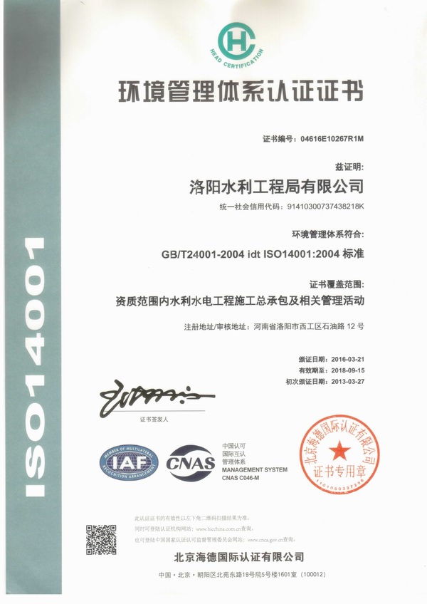 環境管理體系認證證書